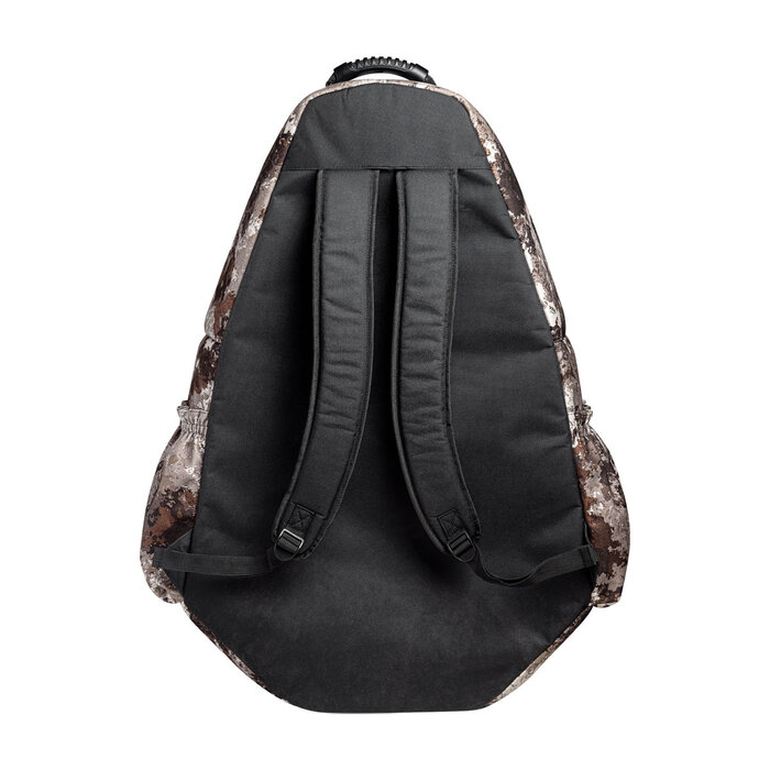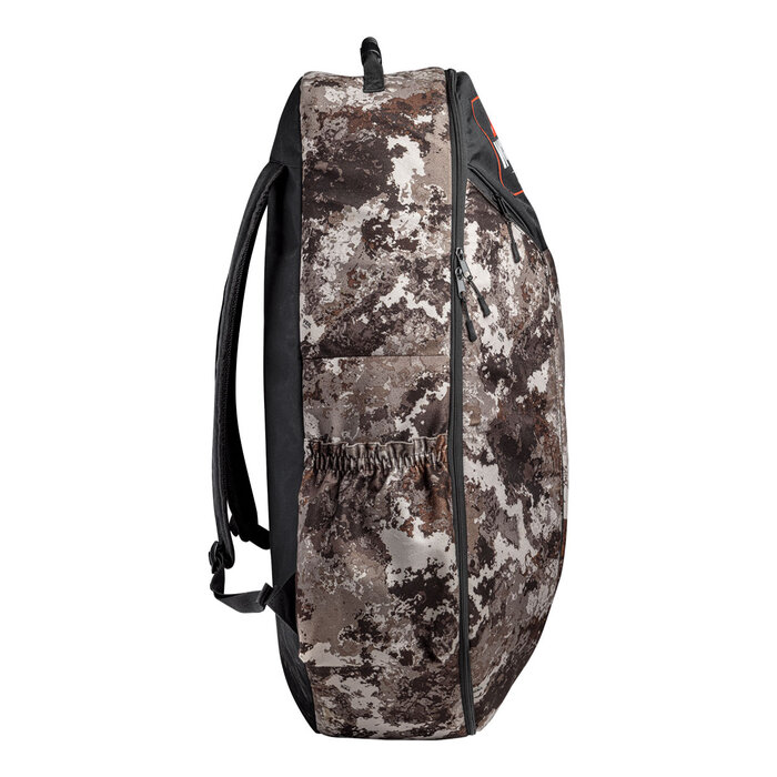 Ideal for treestands or ground blinds, the camouflaged Ambush crossbow bowpack features two external zippered pockets for storing essentials like calls, rangefinders, clothing, or phones, plus two side elastic pockets for water bottles or quivers. Its top-mounted rubber grip handle simplifies transport and allows easy hanging from a tree for quick access.