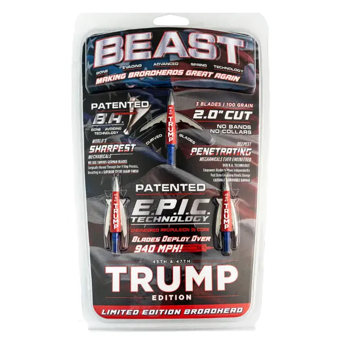 Limited Edition Trump BEAST Broadhead, with patented tech, revolutionizes performance with bone-evading blades, high-speed deployment, premium materials, and a unique retention system. The most advanced, versatile mechanical broadhead. Read more about BEAST TRUMP EDITION BROADHEADS 3 PACK