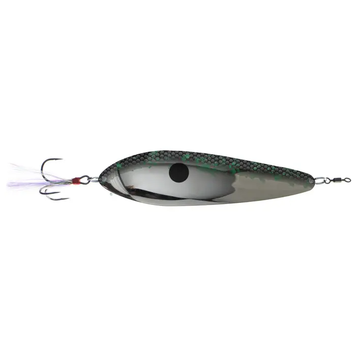 Nichols Bass Mafia Larry Spoon, designed by Chris Zaldain, targets big fish with its wide body and cradling action. Features detailed scale patterns, sharp dressed treble hook, ball bearing swivel, and heavy-duty split ring. Read more about Bass Mafia Big Larry Spoon