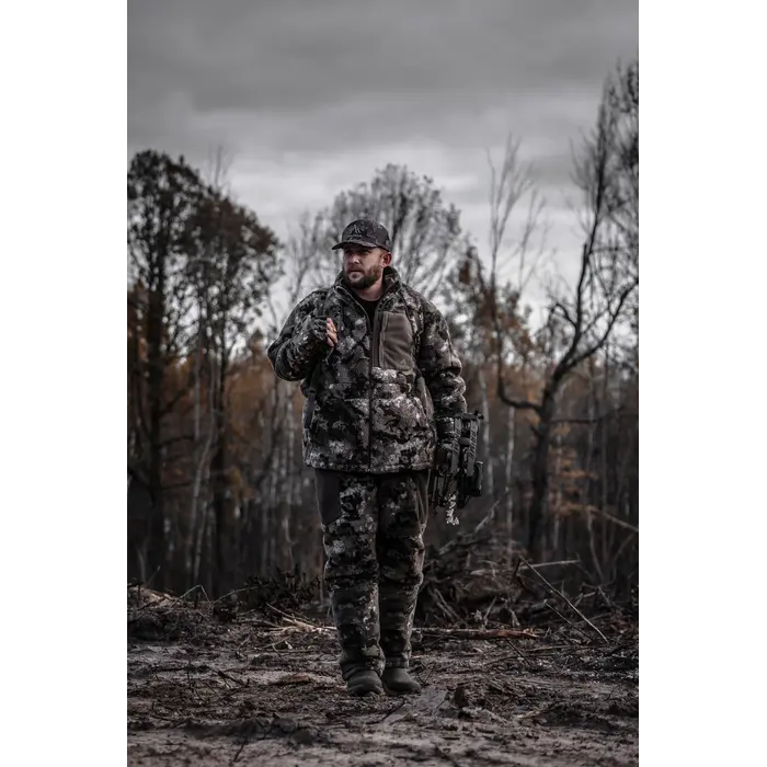 The Pnuma High Point Jacket is tailored for late-season pursuits demanding superior warmth, stealth, and toughness. As Pnuma's warmest offering, it integrates high-loft Berber fleece with PrimaLoft® Silver insulation to combat extreme cold, ensuring comfort on extended sits or deliberate stalks. Its ultra-quiet exterior excels in noise-sensitive scenarios, while microfleece-lined sleeves enhance range of motion. A harness pass-through enables effortless treestand use, and robust fabrics withstand rough landscapes, prolonged exposure, and fierce gusts.