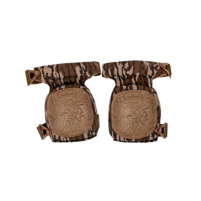The Latitude Knee Pads are designed with an elastic, articulating top joint featuring a grippy interior to prevent slipping during hikes. They offer doubled knee padding for enhanced protection in trees or on the ground. The updated rubberized grip cap includes horizontal and vertical edges for superior two-way slip resistance. Replacing velcro, elastic keepers ensure silent, secure adjustments in the field, making these knee pads a reliable choice for hunters.