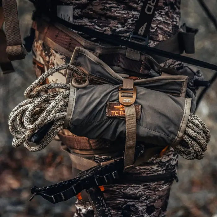 Originally crafted for single stick climbing, the Tethrd Roll UP proves ideal for all saddle hunters. (Note: Rope and carabiner shown for scale are not included.)
