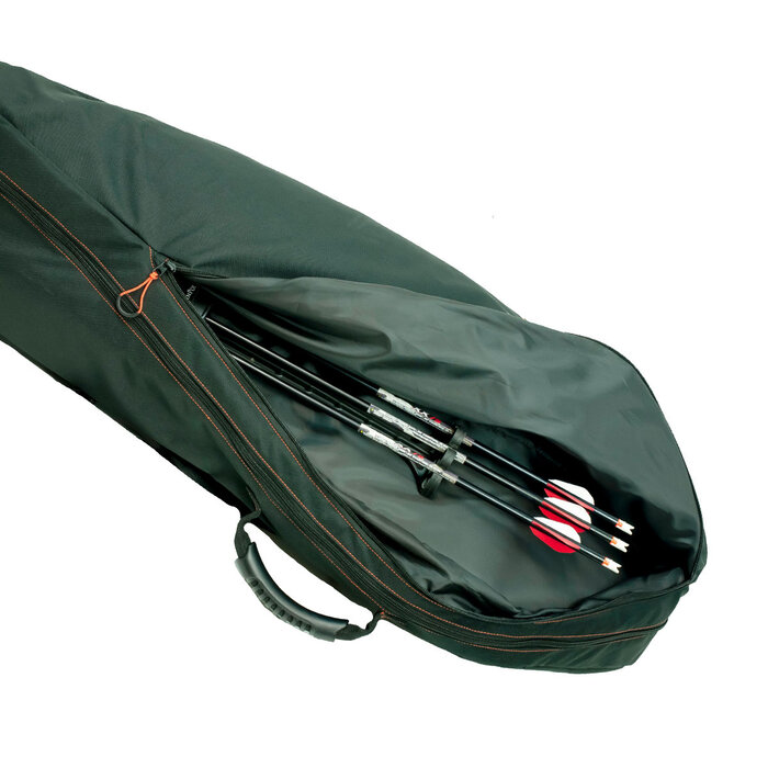 Both lightweight and robust, the lockable case includes an oversized external zippered pocket for storing arrows, quivers, broadheads, lube, and other essentials. A side-mounted rubber grip handle ensures convenient carrying, while two foam-padded, adjustable straps allow comfortable backpack-style transport.